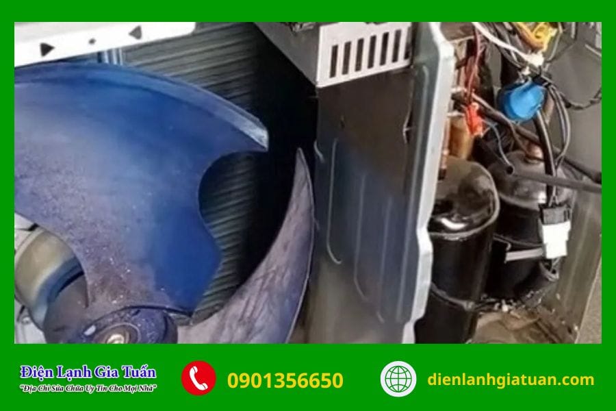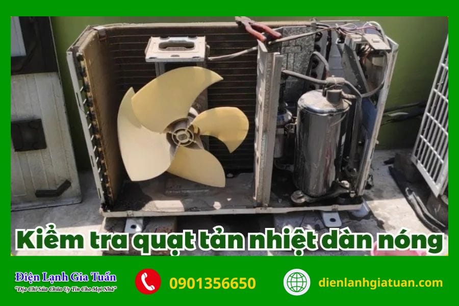Quạt có thể bị kẹt do bụi, khô dầu hoặc hỏng mô tơ, khiến dàn nóng không tản nhiệt hiệu quả và gây quá nhiệt.